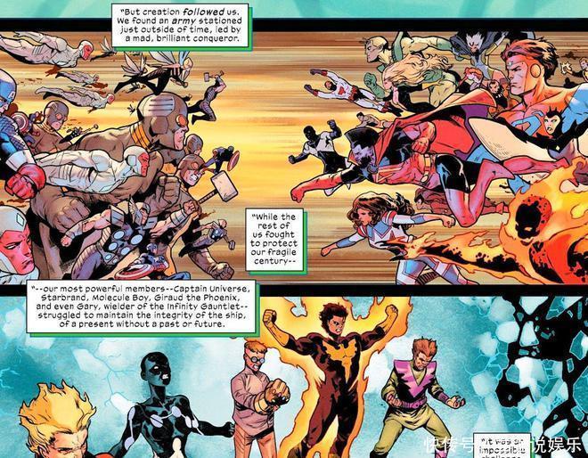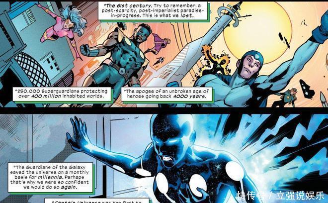 在由丹尼兹·坎普、胡安·弗里杰里、费德里科·布利和特拉维斯·拉纳姆创作的《终极战队 #8》中,终极战队(此乃这个本质中的复仇者定约版块)遭逢了星河护卫队——来自远方的 61 世纪的硬汉。该团队叙述了其将来的时辰线是怎样被诬害的,共享了包括凤凰女、寰宇队长、星标和“无尽手套的执有者加里”在内的一群神一般的硬汉试图扶持它的故事。