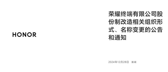 12月28日,荣耀官网发布公告,公告闪现,荣耀末端有限公司已于当日照章完成举座变更,致密改名为“荣耀末端股份有限公司。这次变更对公司的闲居方针活动并无影响。